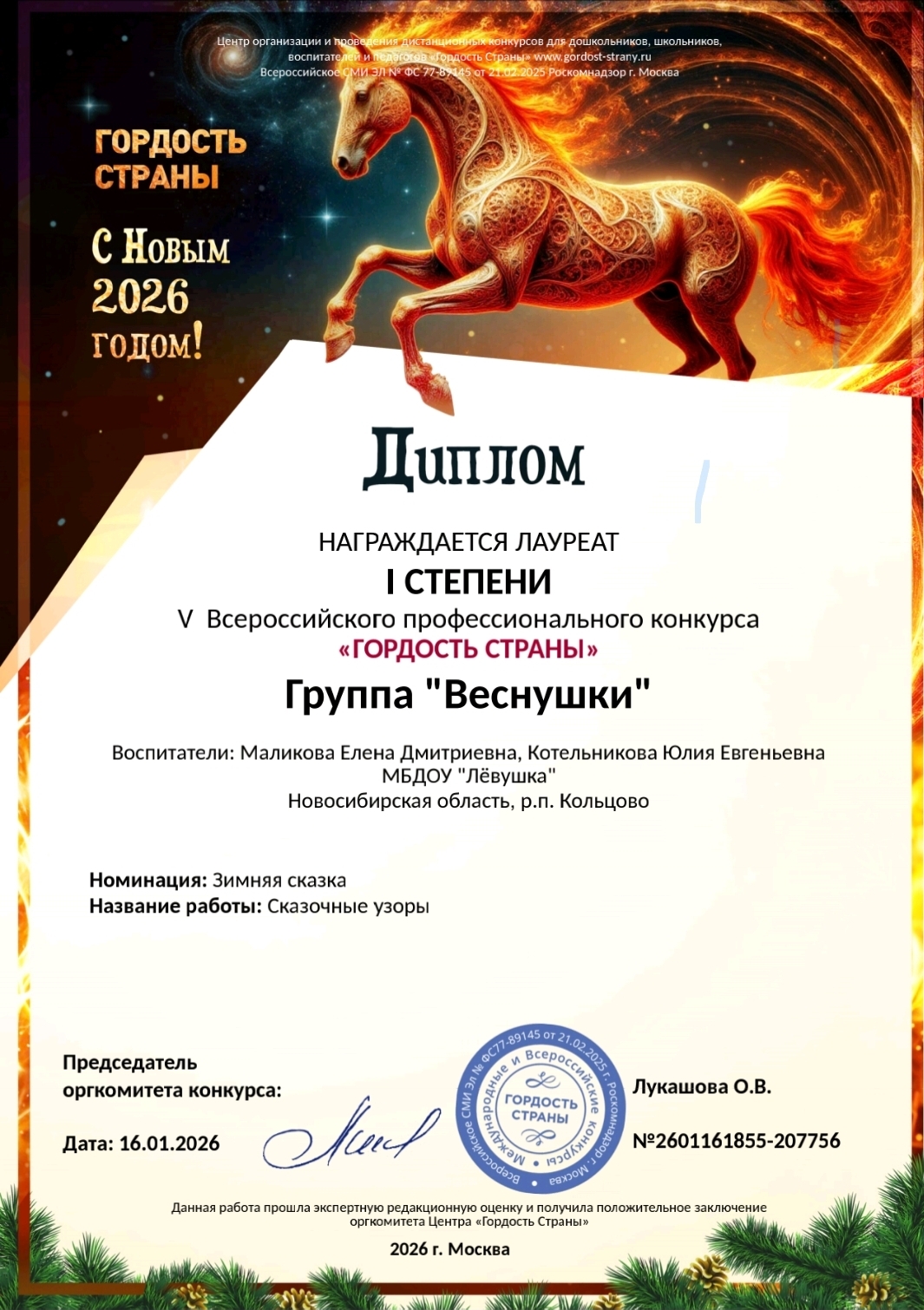 Диплом Лауреата Iстепени в V всероссийском профессиональном конкурсе "Гордость страны" в номинации "Зимняя сказка" "Сказочные узоры на окне"